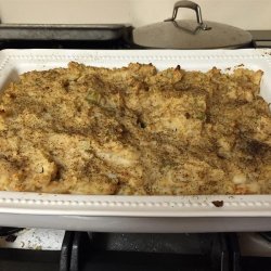 2Melt butter in a large skillet over medium heat. Add onion and celery, and cook, stirring until tender. Stir celery and onion into the mashed potatoes, then mix in the eggs. Break the toasted bread into small pieces, and stir into the potatoes. Season with salt and pepper, and transfer to an 11x7 inch baking dish.