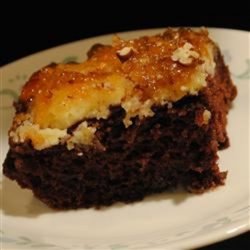 2Spread the entire can of frosting into the bottom of a 9x13 inch baking pan. Refrigerate while the filling is prepared. In a medium bowl, cream together the cream cheese and confectioners' sugar. Stir in the egg, and beat until light. Spread over the frosting. Prepare the cake mix as directed on box, pour over the filling layer, and spread evenly.