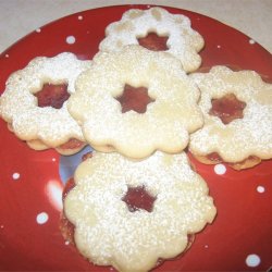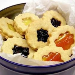Bake for 10 to 12 minutes in the preheated oven, until firm and lightly browned at the edges. Allow cookies to cool completely. Spread jam on the tops of the solid cookies and top with the cookies that have shapes cut out.