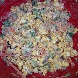"This salad is a real conversation piece. Whoever heard of popcorn in a salad? If you take it to a dinner, mix the salad and carry the popcorn separately to be added at the last minute."