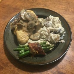 "Boneless chicken breast stuffed with provolone cheese and bacon is covered with a mushroom and Irish creme sauce. Served traditionally with roasted potatoes in a creamy cheese sauce. Any veg will do, but the green beans are awesome!"