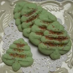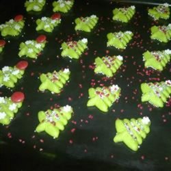 4Place 1/4 of a red or green candied cherry in center of each. Bake in 400 degrees F (200 degrees C) oven 7-10 minutes or until set but not browned. Remove from baking sheets; cool on racks.