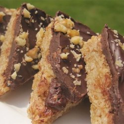 4Cut into 4 large squares to remove from pan. Cover with melted chocolate, and sprinkle with nuts, if desired. Allow the chocolate to cool, and then cut each square into 9 pieces.