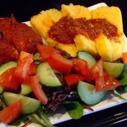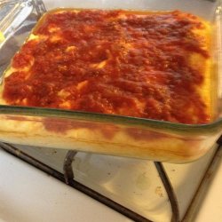 "My entire family loves this recipe. A quick baked polenta topped with red sauce. Very easy to make and great the next day too (and the day after that!) Top with additional Parmesan cheese if you like."