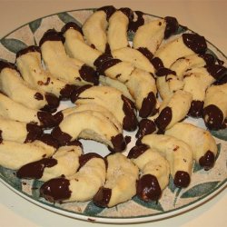 5Bake for about 10 to 12 minutes. Cookies should be white in color. Let cool on cookie sheets for 5 minutes to prevent breaking. Then, while cookies are still warm, carefully roll in vanilla sugar. (May be found in bulk food stores). Repeat with remaining cookies. Cool cookies completely.