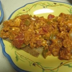 2In a medium bowl, whisk the eggs with a fork until well blended. Push all of the vegetables to one side of the pan. Pour the eggs into the empty half of the pan. Allow them to cook about halfway, then stir everything together, and cook for another 5 minutes. Serve over slices of rye bread.