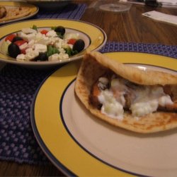 "Greek-style chicken pitas. Instead of yogurt sauce, you can substitute Tzatziki sauce."