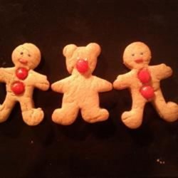 3On a lightly floured surface, roll out dough to 1/4 inch thickness. Cut into bear shapes with a cookie cutter, and place onto an unprepared cookie sheet. Bake for 10 to 15 minutes in the preheated oven, cookies should be firm.