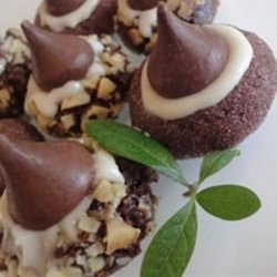 6Spoon 1/4 teaspoon of the filling into each warm cookie; gently press a chocolate kiss (unwrapped) in the center. Carefully remove from baking sheet to wire racks to cool.