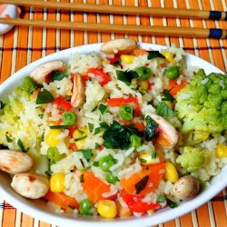 2Meanwhile, place the broccoli, corn, green beans, carrot, and 1/4 cup water into a microwave-safe bowl. Cover, and cook in the microwave at full power until the vegetables are tender, 2 to 4 minutes depending on the microwave. Once the rice has finished cooking, gently stir the vegetables into the rice along with the turmeric, black pepper, and cashews. Sprinkle with cilantro to serve.