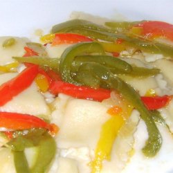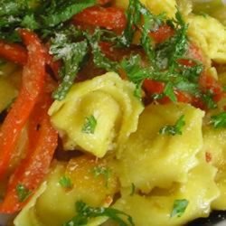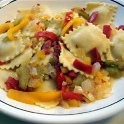 2Heat olive oil in large skillet over medium heat. Saute onion and bell peppers until tender. Add one cup of the broth, season with pepper flakes, and simmer 5 minutes. Stir in remaining broth, and cook until most of broth has evaporated. Spoon pepper mixture over ravioli.