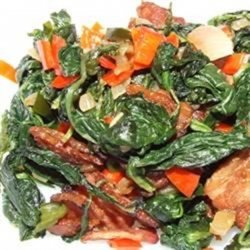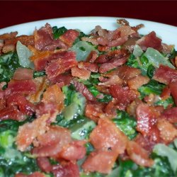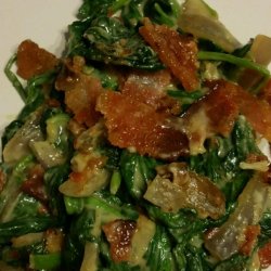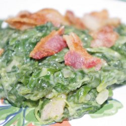 "Savory creamed spinach flavored with onions and bacon. My guests love this. It's not difficult but needs a couple of pans and constant stirring. We think it's worth the work!"