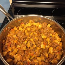 2Heat oil in a large skillet over medium-high heat. Stir in the beef, garlic, and onion, season with salt and pepper. Cook until the beef is crumbly and the onion is soft. Stir in the chopped plantain, cilantro, and tomato. Season with Worcestershire sauce and hot pepper sauce; cook for about 10 minutes until everything is hot.