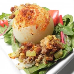 5In the reserved drippings saute green pepper and reserved 1/2 cup chopped onion until tender. Combine with sausage, egg, cooked rice, bread crumbs, oregano and parsley. Spoon mixture into onion shells and place in prepared dish.