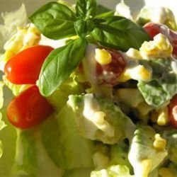 In a large bowl, mix the lettuce, corn, avocado, and tomatoes. Drizzle with dressing and sprinkle with pine nuts. Toss and serve.