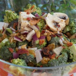 2Combine broccoli, red onion, raisins, mushrooms, sunflower seeds, and crumbled bacon in a large bowl.
