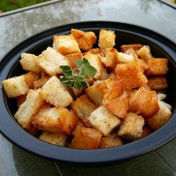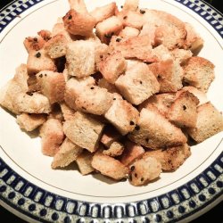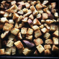 2In a large saute pan, melt butter over medium heat. Stir in garlic; cook and stir for 1 minute. Add bread cubes, and toss to coat. Spread on a baking sheet.