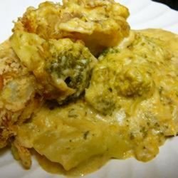 2In a large bowl, mix together cream soups, cheddar cheese, sour cream, and mustard. Stir in potatoes and broccoli. Spoon into prepared casserole dish. Top with crushed crackers.