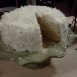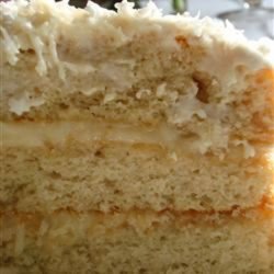 7Assemble the cake by placing one cake layer on a serving platter. Spread it with a layer of the reserved filling and top with another cake layer. Spread the cake with the filling and top with the remaining cake layer. Ice the top and sides of the cake and sprinkle the top with 1/2 cup shredded fresh coconut.