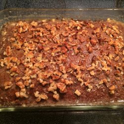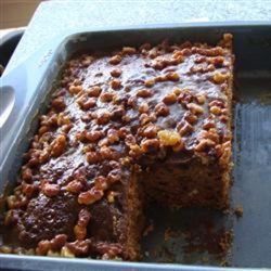 4Make Topping: In a saucepan, melt 4 tablespoons of butter. Stir in brown sugar, cream and chopped nuts. Spread mixture over warm cake and place under broiler until lightly browned, about 3 minutes. Watch carefully - it burns easily under the broiler. Cool before serving.