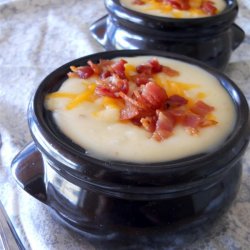 1In a 3 quart sauce pan, combine potatoes, onion, bacon, and enough water to cover ingredients. Place lid on pot, and cook until potatoes are tender. Stir occasionally to prevent sticking.
