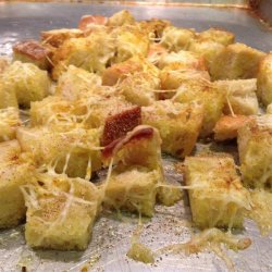 2Remove crusts from stale bread slices. Brush bread on both sides with melted butter. Cut bread slices up into small cubes. Sprinkle with garlic salt (if desired). Arrange cubes on an ungreased cookie sheet.