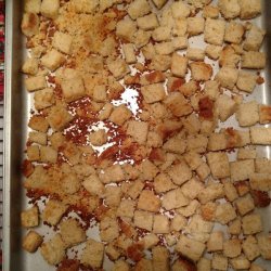 3Bake at 350 degrees F (175 degrees C) for 15 minutes or until browned. Let cool. Store croutons in a covered container or plastic bag. Serve in soups or salads.
