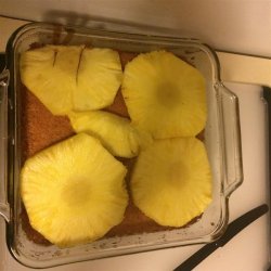 6Bake at 325 degrees F (165 degrees C) for about 1 hour or until golden brown and firm to the touch. Invert pan on rack to cool. Once cake is cool loosen sides with a spatula and remove from pan. Frost cake with whipped cream and garnish with wedges of pineapple and maraschino cherries.