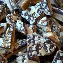 3Bake in preheated oven 15 minutes. Sprinkle chocolate chips over hot toffee. When chips turn glossy, spread evenly with spatula. Sprinkle with almonds. Freeze 20 minutes before serving.