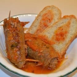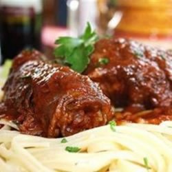 2Heat oil in Dutch oven over medium-high heat. Brown roll on all sides, 1 to 2 minutes a side. Pour in spaghetti sauce, reduce heat to low, and simmer, covered, for 60 to 90 minutes, until tender.