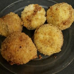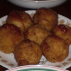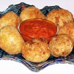 5Heat oil in a deep-fryer to 375 degrees F (190 degrees C). Carefully place the rice balls into the hot oil, a few at a time, and fry until golden brown on all sides, about 3 minutes. Remove with a slotted spoon, and set on paper towels to drain. Serve hot with marinara sauce for dipping.