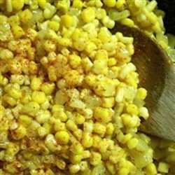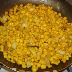 1Melt butter in a large skillet over high heat. Add the onion and corn. Cook, stirring frequently until the corn begins to brown at the edges, about 7 minutes. Season with curry powder, garlic powder, salt and pepper.
