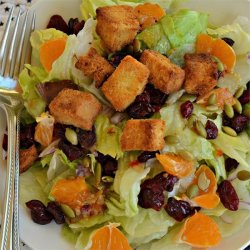 3Cut each bread slice into 16 cubes; add bread cubes and garlic powder to melted butter. Stir to coat. Transfer coated bread cubes to the prepared baking sheet.