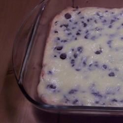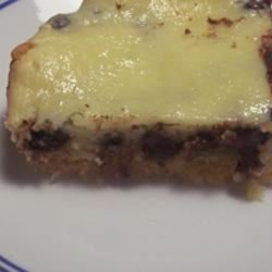 2In a large bowl, mix together the cake mix, melted butter and 1 egg until smooth. Batter will be thick. Spread evenly into the bottom of the prepared pan. Next, sprinkle the chocolate chips over the layer of dough. Finally, beat the cream cheese, 2 eggs and confectioners' sugar together in a medium bowl until smooth. Pour as evenly as you can over the chocolate chips.