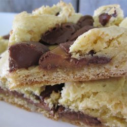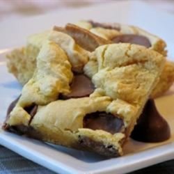 3Bake at 350 degrees F (175 degrees C) for 15 minutes. Remove from oven and immediately place Rolo pieces, cut side down, over hot crust. Drop remaining cake mix mixture by teaspoonfuls over Rolo pieces. Return to oven and bake for 25 to 30 minutes or until lightly browned. Cut into squares to serve.