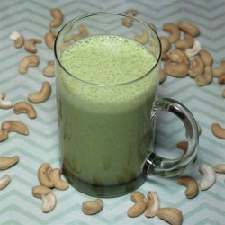 Mix almond milk and protein powder together in a cup; pour into a blender. Add spinach, pear, cashews, and green tea powder; blend until smooth.
