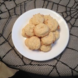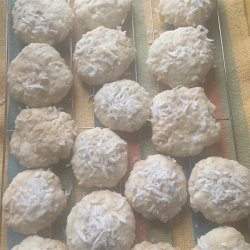 2With an electric mixer, cream together the sugar, vegetable shortening, egg, and vanilla extract in a bowl until light and fluffy. Sift 1 cup plus 2 tablespoons of flour together with the baking powder and salt in a bowl, and stir the flour mixture into the creamed mixture; mix in the coconut until thoroughly combined. Drop the dough by teaspoons onto the prepared baking sheets.
