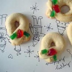 3Take a walnut sized piece of dough, and roll in palms of hand to create a 4 to 6 inch rope. Bring ends together to form a circle, and fold ends over each other. Brush with a mixture made from beaten egg white and 2 teaspoons sugar; this makes a glossy finish. Add green citron slices for "leaves" and 1/2 red citron cherry for" berry" - use to decorate at the knot.