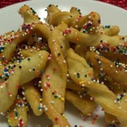 6Combine honey and sugar in saucepan and boil over low flame about 2 minutes, stirring constantly. Add fried dough balls, 1 cup at a time, and cook in honey syrup, stirring constantly, for 1 minute. Remove and put strufoli on flat plate to cool. Sprinkle with pine nuts and confectioners' sugar as soon as they are cool enough to handle, and mold about 5 together in a cluster. Enough for 8, or so. Strufoli will stay fresh for weeks if they are kept in a cool place.