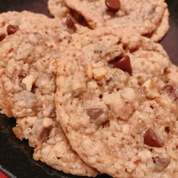 3Sift the flour, baking powder, baking soda and salt together and add to the butter mixture. Stir just until blended. Stir in the oats until well blended. Fold in the chocolate and walnuts.