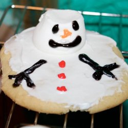 9Press 1 marshmallow close to an edge of each cookie to be the snowman's head. Draw 'stick arms' onto the icing using the melted chocolate.