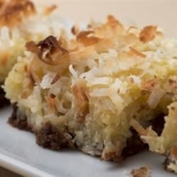 3To make Topping: Beat together the two eggs, brown sugar, baking powder, flour, vanilla, walnuts and coconut. Spread over warm crust.
