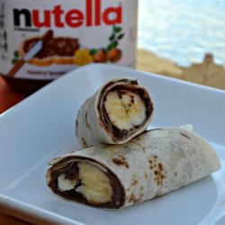 2Thinly spread chocolate hazelnut to all edges of the tortilla, covering completely. Place banana near an edge of the tortilla and roll tortilla around the banana. Cut into halves.