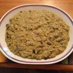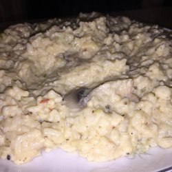 2Pour the milk and cream into the skillet, and stir in the rice. Heat to a simmer. Stir the vegetable stock into the rice one cup at a time, until it is absorbed.