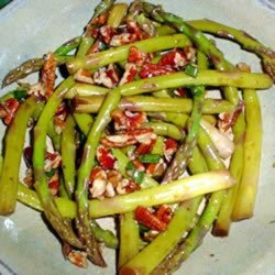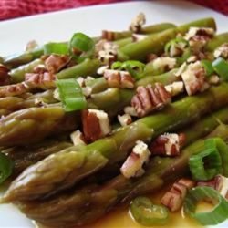 2In a large, resealable plastic bag, mix the rice vinegar, soy sauce, vegetable oil, sugar, salt, and pepper. Seal the asparagus in the bag. Marinate 24 hours in the refrigerator. Sprinkle the marinated asparagus with pecans and green onion to serve.