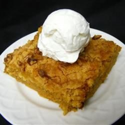 2Mix pumpkin, evaporated milk, sugar, eggs, and pumpkin pie spice together in a bowl. Pour pumpkin mixture into prepared baking dish. Sprinkle cake mix over pumpkin mixture; drizzle with butter. Sprinkle pecans atop butter layer.