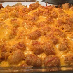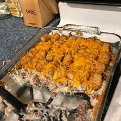 3Spread the beef mixture evenly over the bottom of a 2 quart casserole dish. Arrange tater tots evenly over beef layer. In a small bowl, stir the soup into the milk until smooth; pour over tater tot and beef layers. Sprinkle Cheddar cheese evenly over the top.